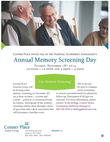 ConnerPlace Assisted Living will be hosting a free memory screening on November 18th, 2014, from 10:00am-12:00pm and 2:00pm-4:00pm at 2 Cottonwood Lane in Canyon. Participants of the memory screening will be taken through a series of questions and a short assessment that will determine a baseline score. The score can be used to compare yearly screenings or uncover potential needs for physician follow-up. Participants of all ages are welcome. For more information, please contact Trisha Kellogg, Conner Place Community Relations Manager at 806-340-3243 or tkellogg@enlivant.com.
